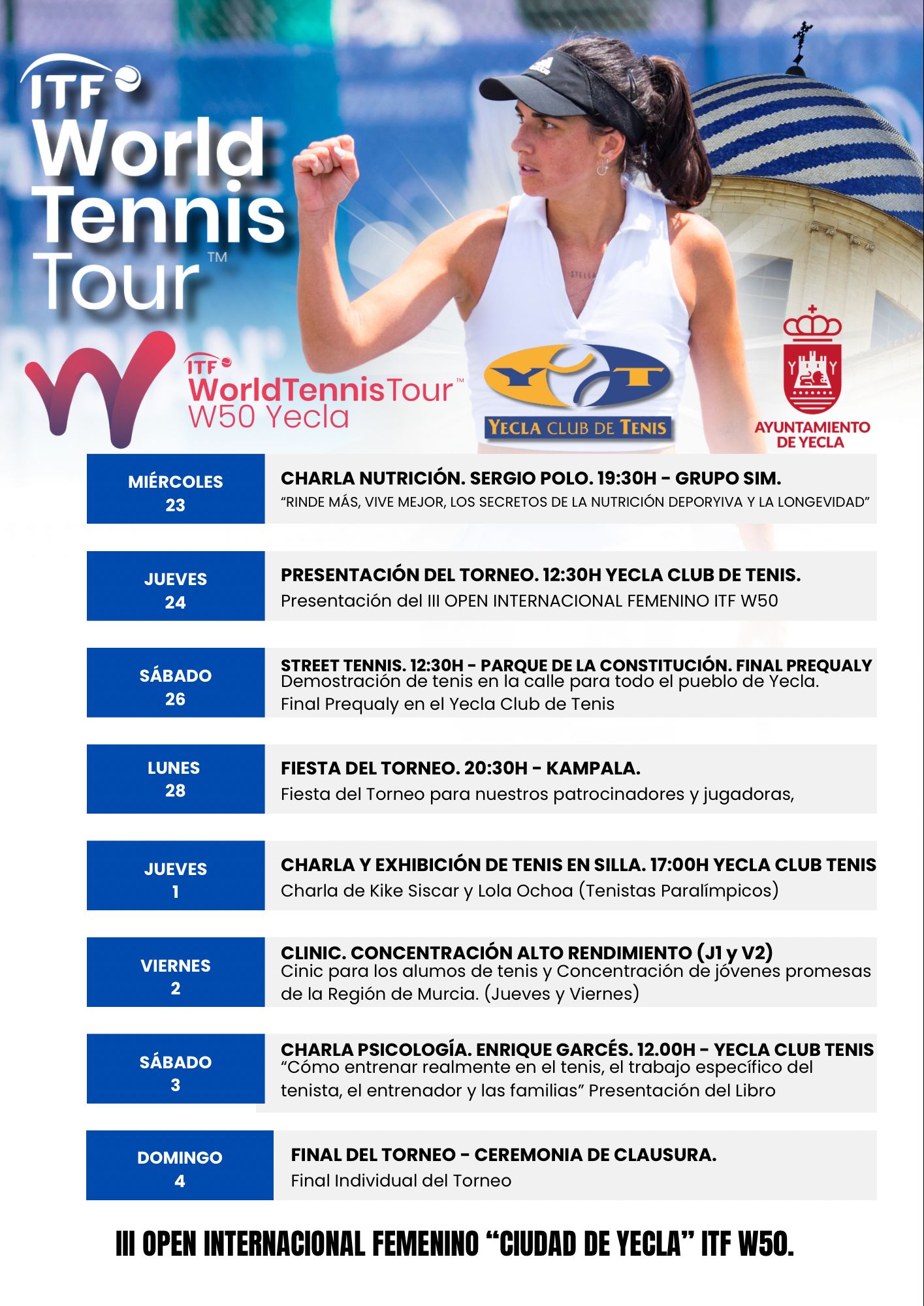 Más allá de la competición, el torneo ofrece un completo programa de actividades paralelas diseñadas para involucrar a toda la comunidad deportiva de Yecla. Este miércoles, el nutricionista yeclano Sergio Polo impartió una charla sobre nutrición deportiva bajo el título “Rinde más, vive mejor”, mientras que el sábado 26 el Parque de la Constitución acogerá una exhibición de Street Tennis abierta a todos los vecinos donde participarán jugadoras del torneo. El componente social también estará presente con una exhibición de tenis en silla a cargo de los deportistas paralímpicos Kike Siscar y Lola Ochoa, una iniciativa que refleja el espíritu inclusivo del evento. Los más jóvenes tendrán su espacio con un clinic de alto rendimiento dirigido a las promesas del tenis murciano, y el sábado 3, el psicólogo Enrique Garcés abordará las claves del entrenamiento mental en el deporte a través de una charla.