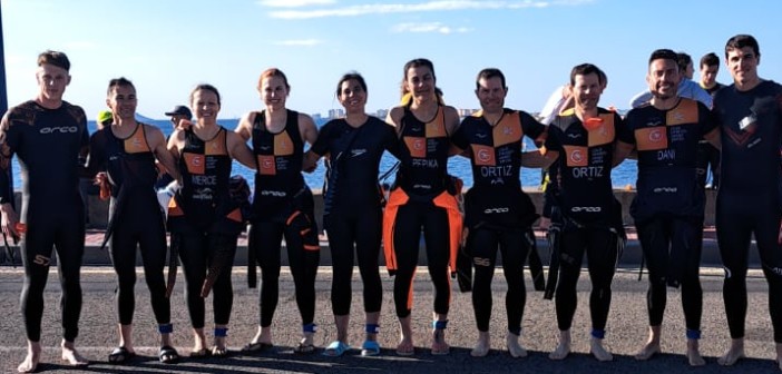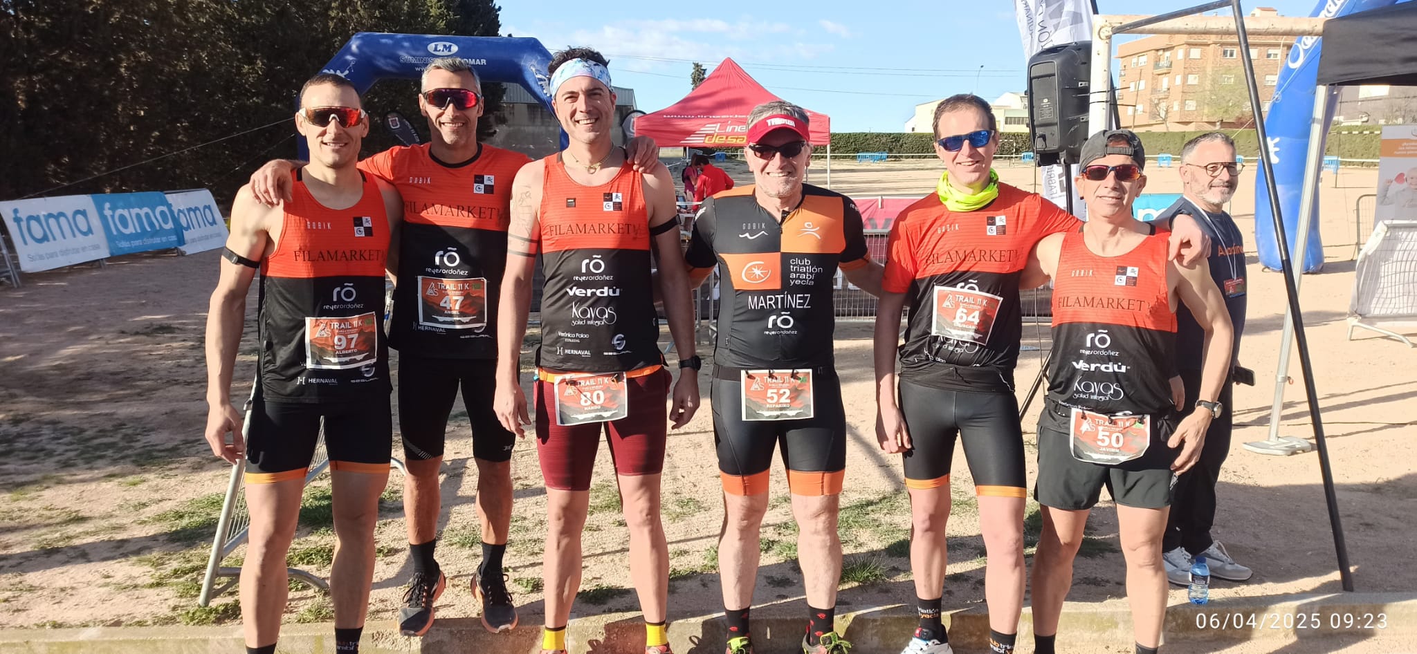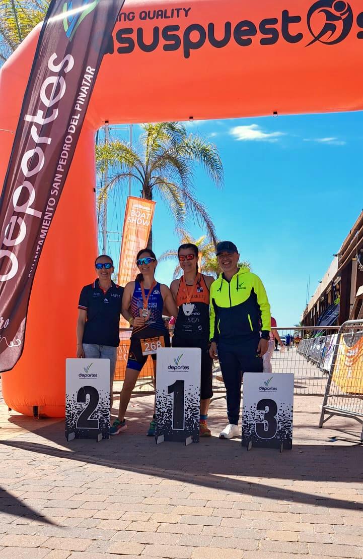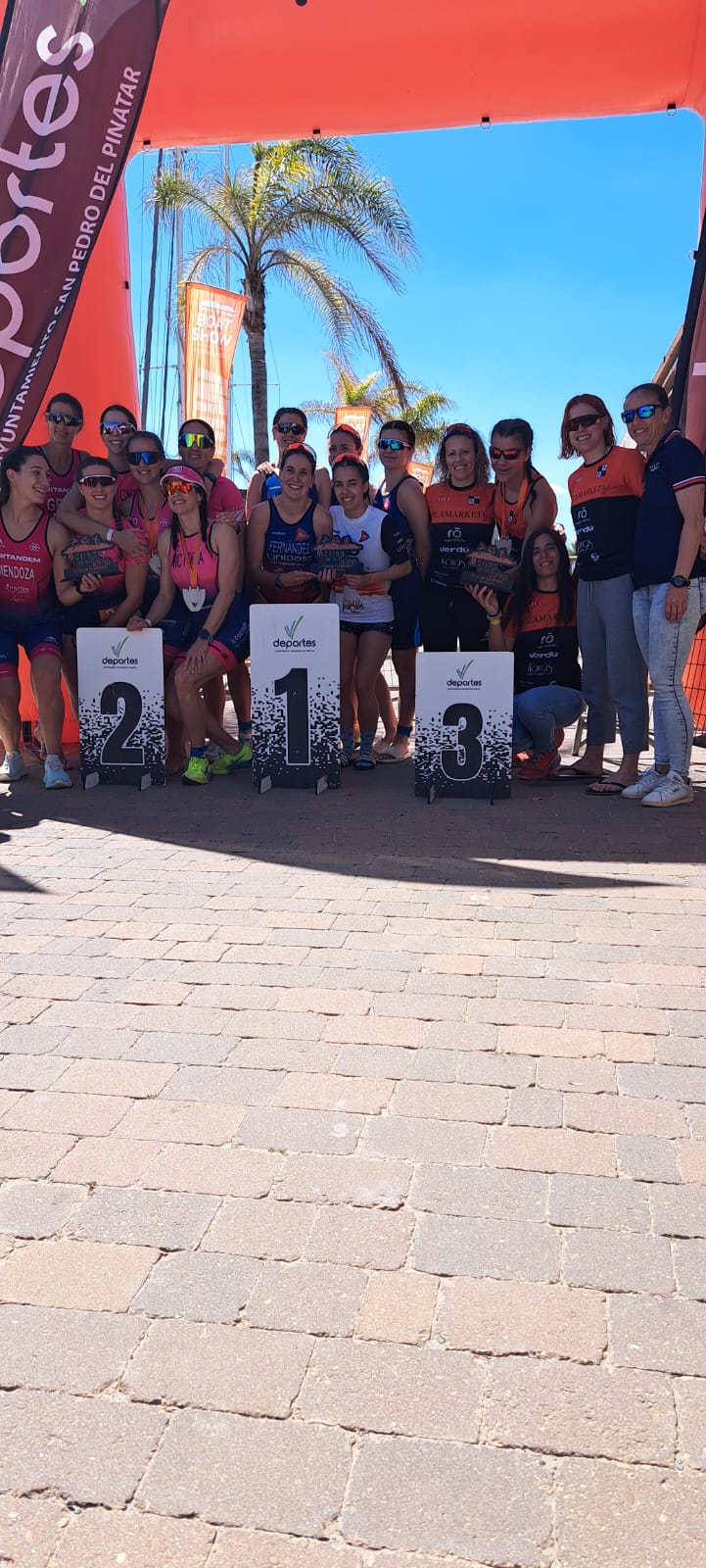 Otro fin de semana intenso de competiciones para el Club de Triatlón Arabí Yecla. El domingo 6 de abril daba comienzo la Liga Regional de Triatlón con el XV Triatlón Maria de las Salinas en San Pedro del Pinatar. Allí participaron 10 socios del club yeclano, que tomaron contacto con el mar en una prueba muy rápida por las condiciones. Dos podios consiguió el club yeclano, uno individual de Pepika Soriano, quien fue 1ª en su categoría de Veteranas y el equipo femenino formado por Alba, Mercedes, María y Pepika se hicieron el 3º puesto de equipos femeninos.