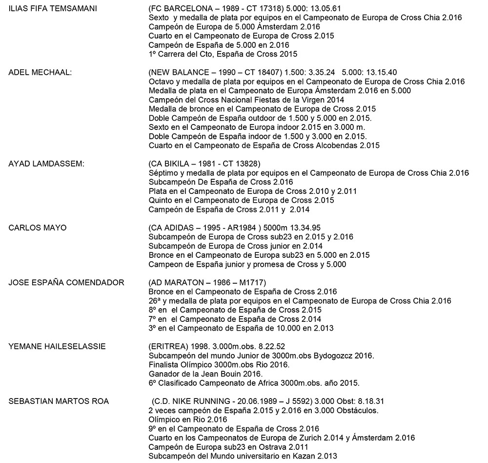 En el plano masculino destacan cuatro de los miembros del equipo nacional que compitió en Chia el pasado fin de semana y que lograron la medalla de plata. Ilias Fifa, Ayad Lamdassem, José España y Adel Mechaal, vencedor en 2014, serán los principales atractivos pero no los únicos. Los atletas Yemane Haileselassie, olímpico en Río, Sebastián Martos o Carlos Mayo, una de las promesas emergentes del país, completarán un cartel de lujo en línea de salida.
