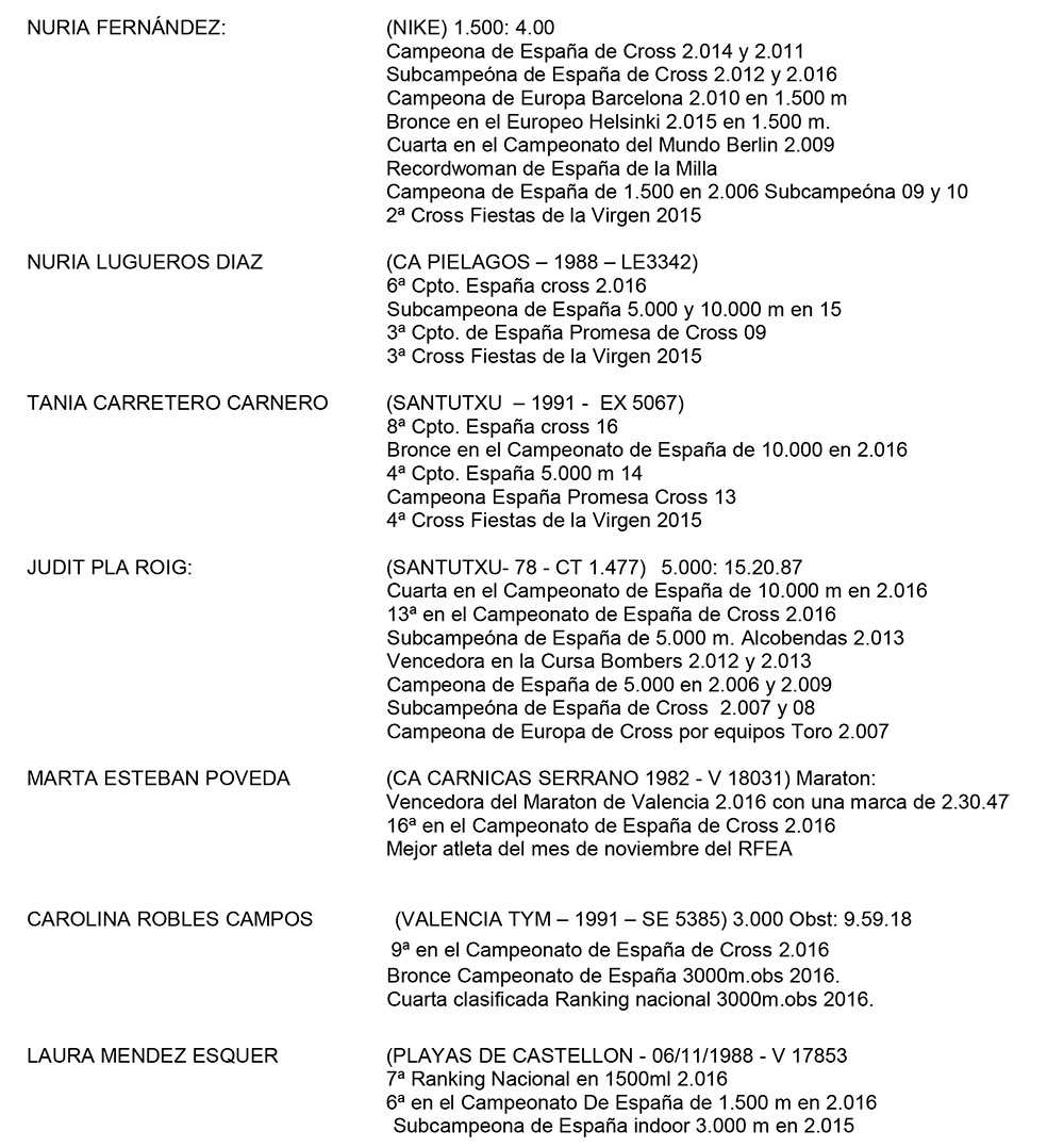 En cuanto a mujeres, el nivel no es menor. Nuria Fernández, subcampeona el pasado año en Yecla, Nuria Lugueros y Judit Plá serán las atletas a seguir a final de carrera. Tania Carretero y las valencianas Marta Esteban, Carolina Robles y Laura Méndez completarán un primer abanico de favoritas que harán vibrar a los asistentes con una prueba muy disputada.