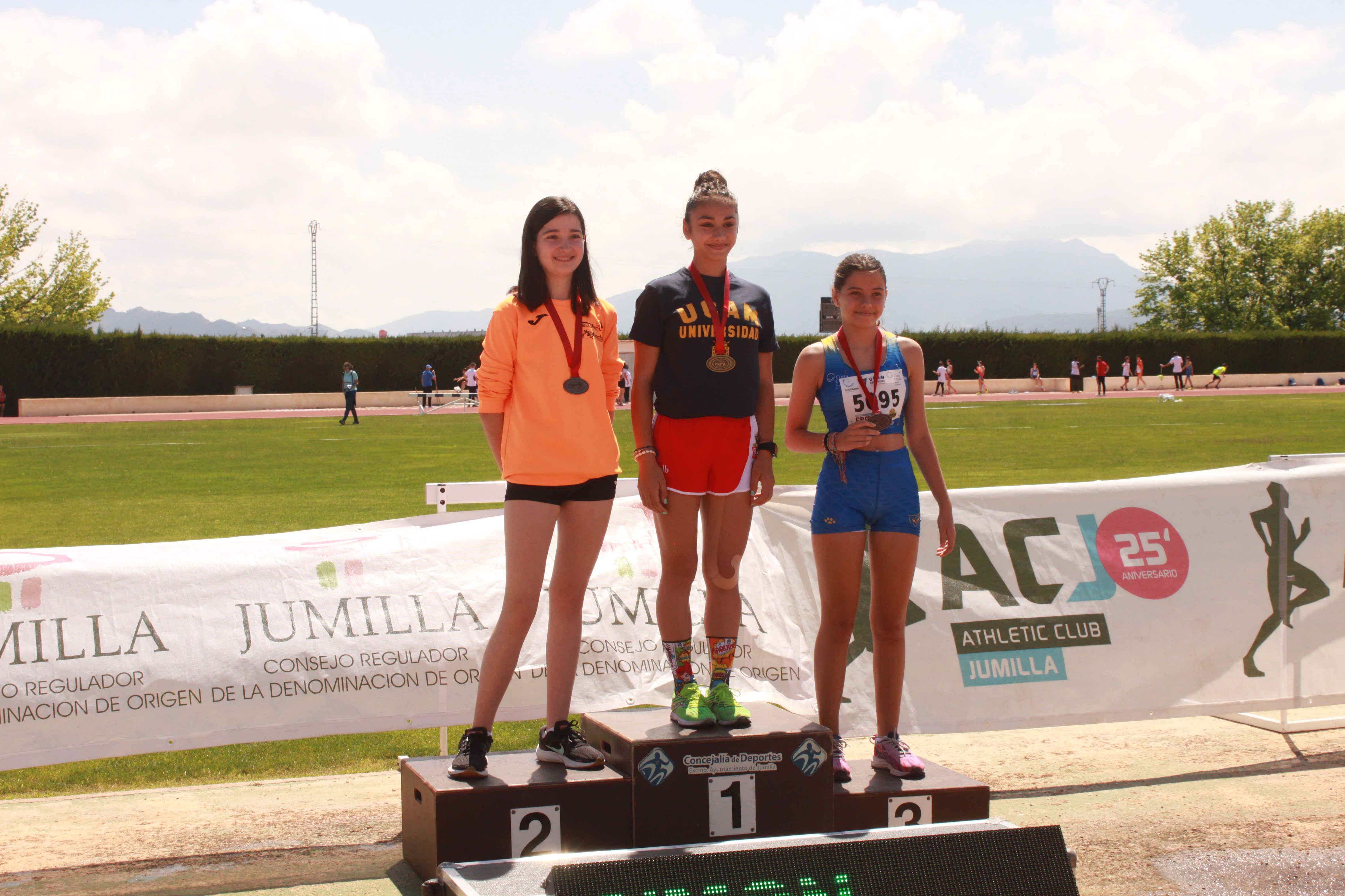 Ya en la Región de Murcia, ocho atletas del ADA Yeclano se desplazaron a Jumilla para participar en las finales del campeonato regional sub-16. Entre ellos, destaca la actuación de Carmen Román en lanzamientos largos, donde conquistó dos medallas de oro al conseguir las victorias en disco y en martillo. También consiguió un oro Saray García, venciendo en los 100m con un tiempo de 12.90, a la misma vez que logró también una plata en 300m. Ariadna Zornoza aportó otro de los oros, con una marca de 48.67 en los 300m vallas. Ariadna, además, fue segunda en los 100m y quinta en longitud. Gracias a estas marcas, y a las registradas durante la temporada, Carmen Román, en martillo; Saray García, con los 100m y 300m; y Ariadna Zornoza, con los 100m, 300m y 300mv, se encuentra en posiciones de repesca para el Campeonato de España SUB-16.