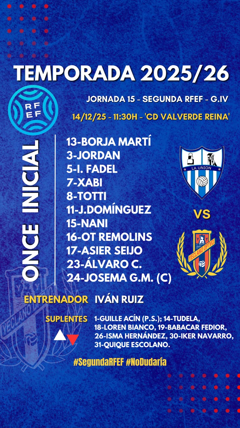 FINAL. El Yeclano Deportivo empata 0-0 en Totana ante La Unión en un partido marcado por la lluvia y el mal estado del terreno de juego. El equipo de Iván Ruiz fue superior en la primera parte, generando ocasiones y estrellando dos balones en la madera. Tras el descanso el encuentro se igualó, y se vio afectado por la tormenta que imposibilitó el juego. El Yeclano mantiene el orden defensivo para sumar un punto con buenas sensaciones.