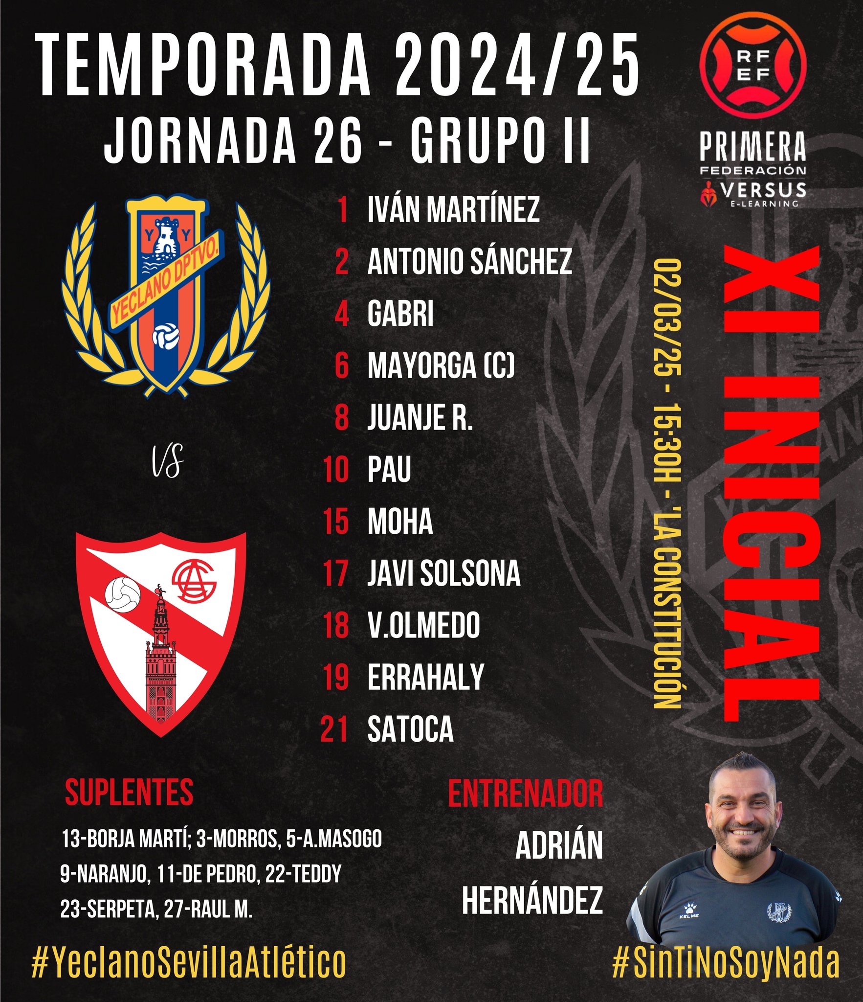 15:15 | Buenas tardes a todos. En la tarde de hoy se enfrentan el Yeclano Deportivo y el Sevilla Atlético. Partido importante para los de Adrián que sería muy importante ganar tras la serie de resultados de sus rivales en el día de ayer. Tarde fría y lluviosa en ‘La Constitución’.